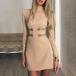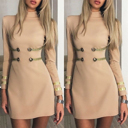 Portray your elegant and charming image through this delicate dress. It comes with a solid color,designed with long sleeve,mock neck and a fit silhouette,this dress can showcase yoru slender figure. The unique waist design makes this piece look more distinctive. For some fancy events,this dress would be a wise choice.