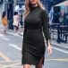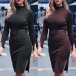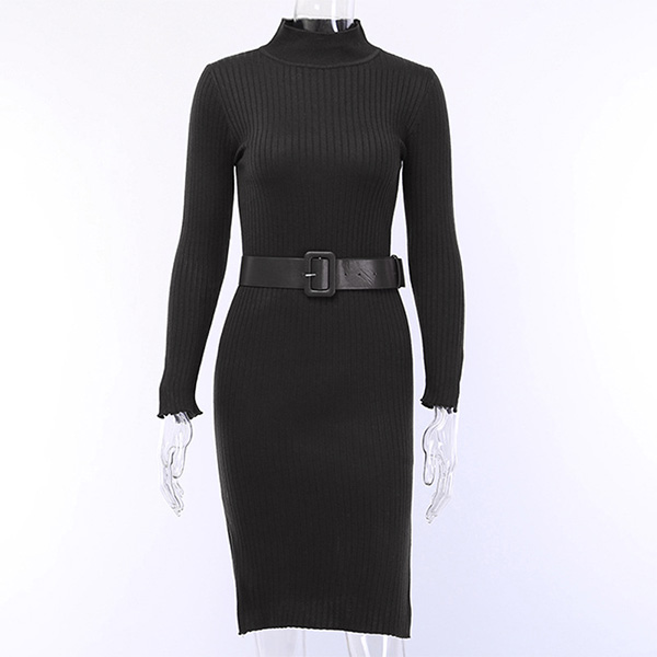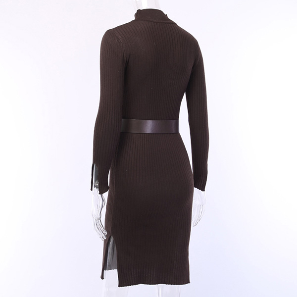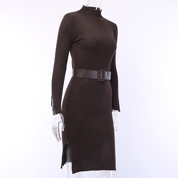 Elegant Solid Color Long Sleeve Mock Neck Slit Hem Slim Fit Knit Dress