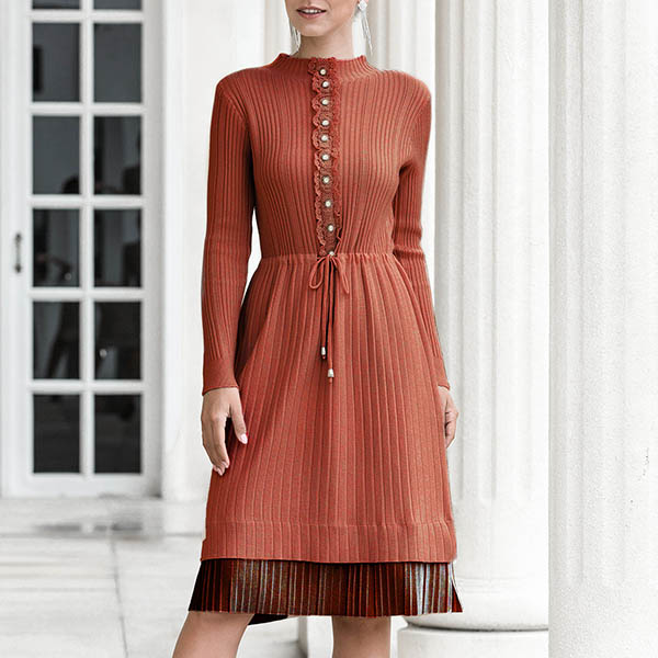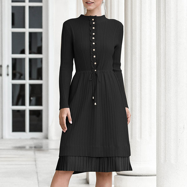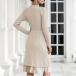 Elegant Solid Color Long Sleeve Pleated Spliced Hem Knit Dress