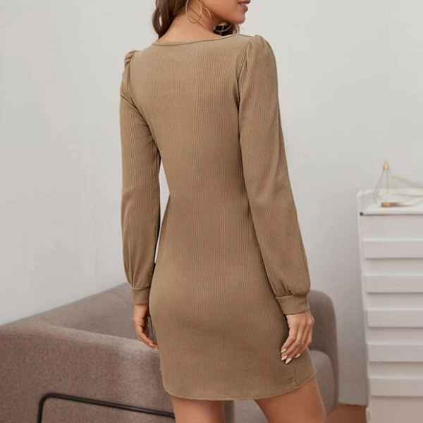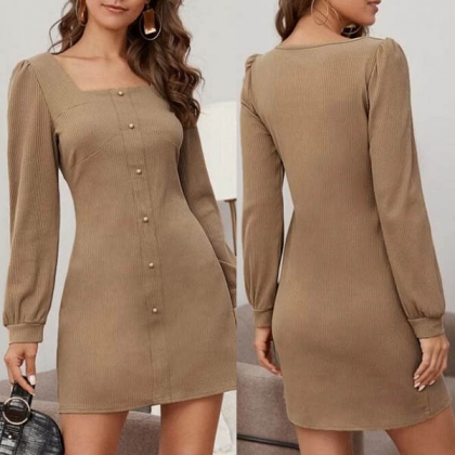Elegant Solid Color Long Sleeve Square Collar Front-button Dress
