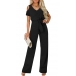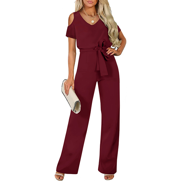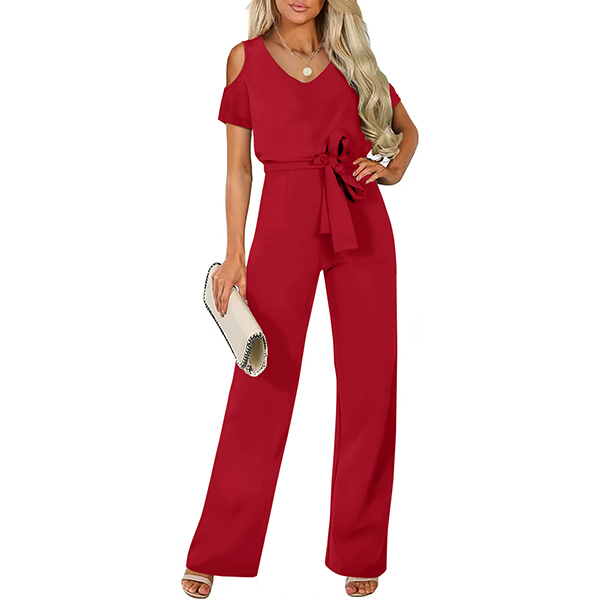 This chic and versatile jumpsuit features a solid color design with an open-shoulder design, V-neckline, and self-tie detailing that makes it perfect for any occasion. The flowy fabric and comfortable fit add a touch of femininity and sophistication to your look.