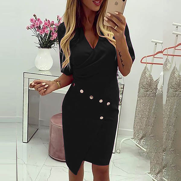 If you're in search for a dress that can easily boost your femininity,then look no further than this piece. Crafted in a solid color,the v-neck,irregular hem and front button design make this piece look so sexy and flirty. So why not slip into this dress to stay elegant and charming from day to night!
