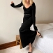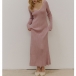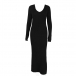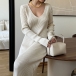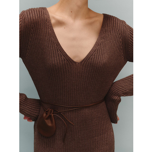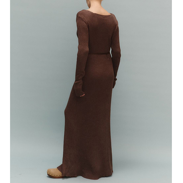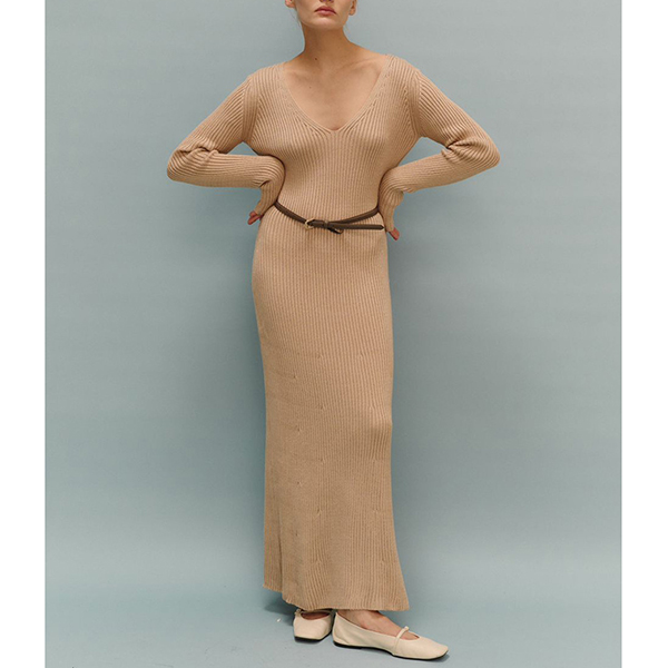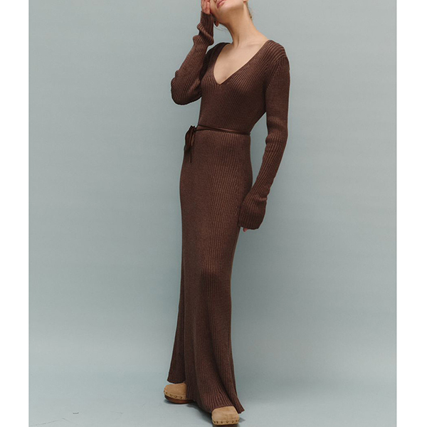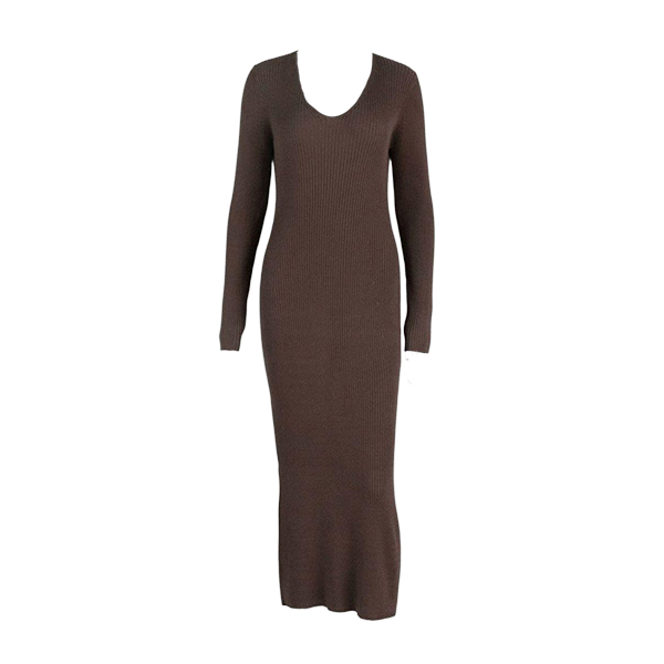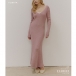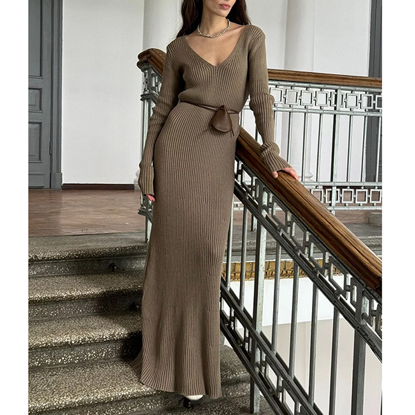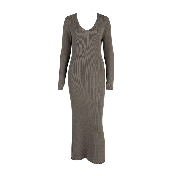 Maxiklänning i ribbat material med långärmad V-ringning och enfärgad kroppsnära passform