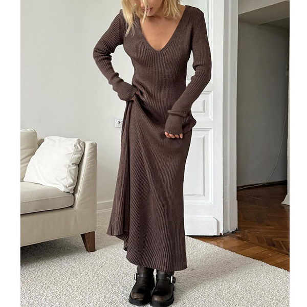 Upptäck en sofistikerad maxitröja som förenar tidlös femininitet med modern elegans. Den smickrande V-ringningen och den kroppsnära, ribbstickade konstruktionen framhäver din naturliga siluett med lyxig textur. Till skillnad från vanliga klänningar erbjuder denna golvlånga bodycon-design en perfekt balans mellan dramatik och raffinemang, vilket skapar ett avlångt, statylikt intryck vid formella middagar, eleganta bruncher eller speciella tillfällen. Den klassiskt enfärgade ytan ger obegränsade stylingsmöjligheter och bidrar med tidlös charm, medan materialets stretchiga kvalitet säkerställer en bekväm passform hela dagen. En maximal look för den moderna kvinnan som vill stå ut med enkel elegans och exklusiv känsla.
