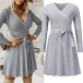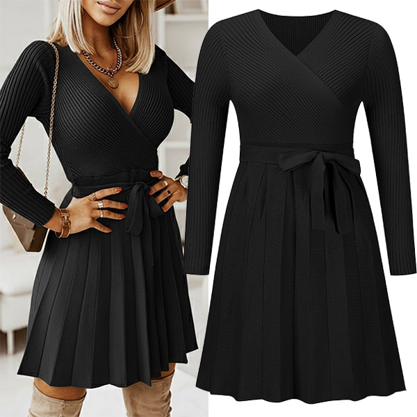 Klänning för att imponera i denna eleganta stickade klänning. Designen med V-ringning är både smickrande och stilren, medan den plisserade kjolen med självknyta tillför en touch av femininitet. De långa ärmarna är perfekta för kallare dagar eller kvällar, medan den enfärgade färgen säkerställer att den här klänningen matchar alla accessoarer du väljer.