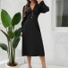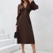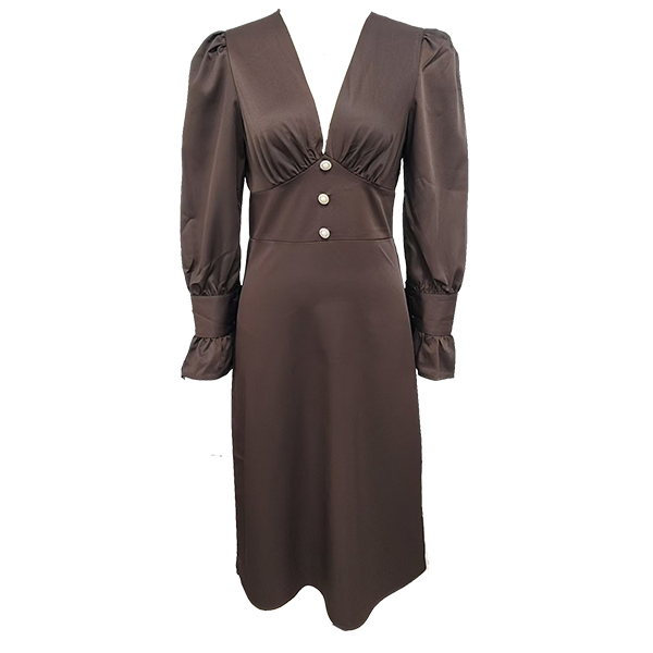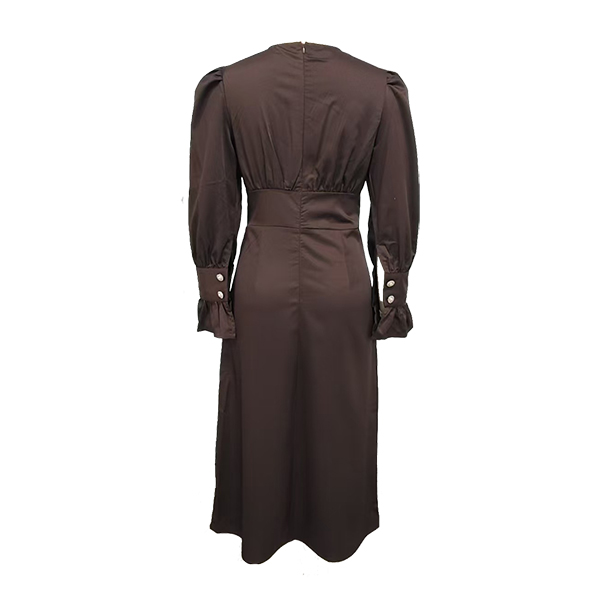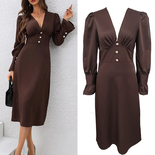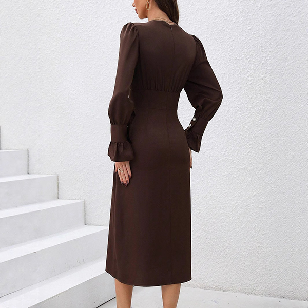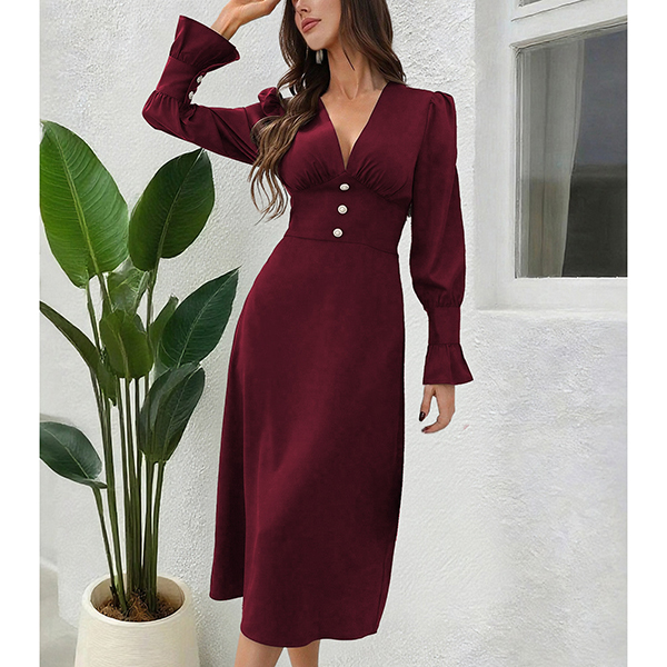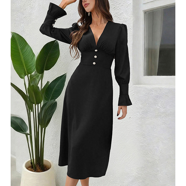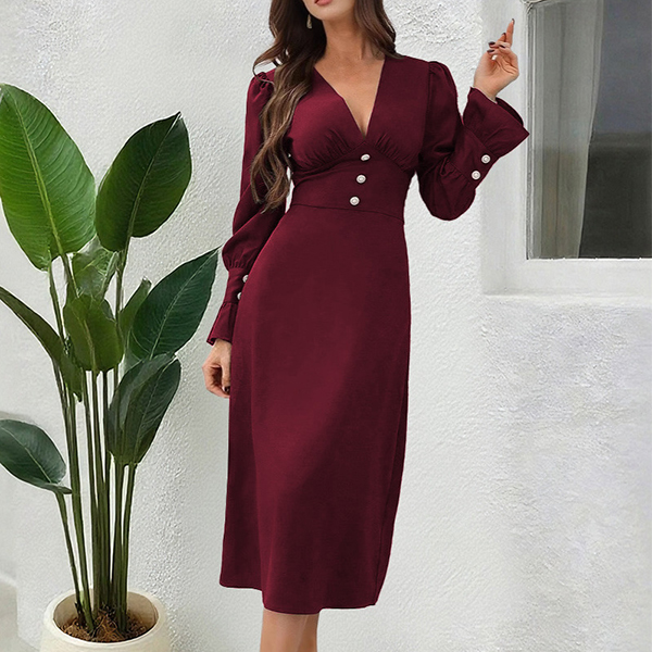 This elegant dress features flattering V-neck styling with dramatic puff sleeves and comfortable high-rise waistline for contemporary elegant sophistication. Perfect for elegant occasions, sophisticated styling, or contemporary formal wear.