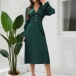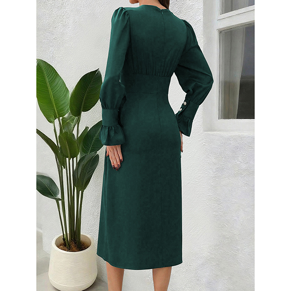 Klänning – elegant enfärgad med V-ringning, långärmade puffärmar och hög midja