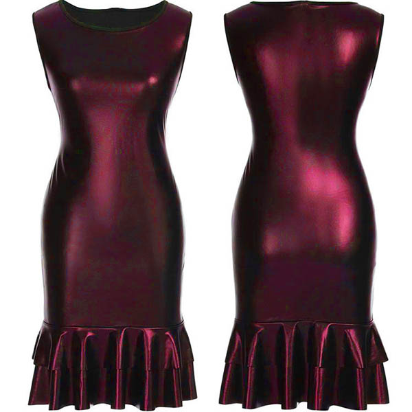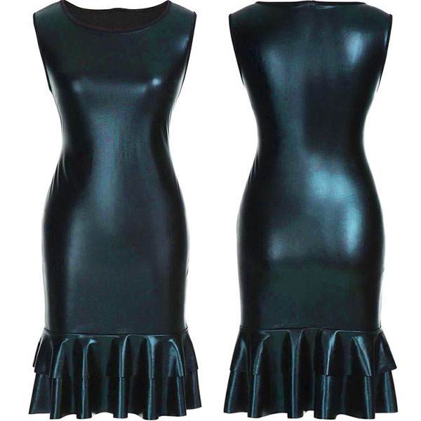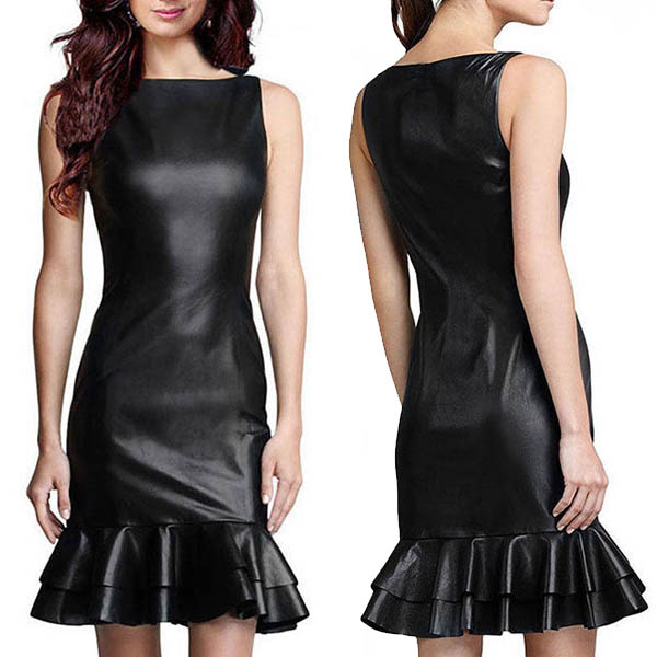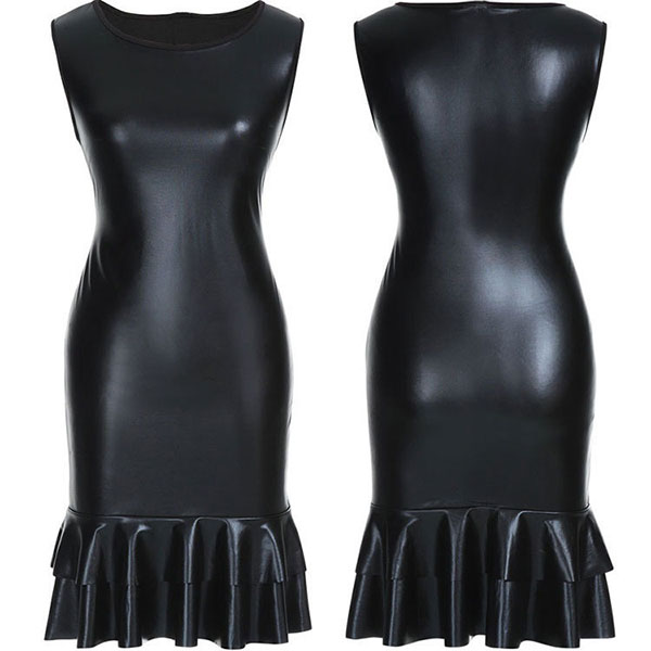 For your fancy events,you can trust in this PU leather dress to portray your elegant and charming image. It is finished with sleeveless,round neck,ruffle hem and a fit silhouette,this dress would be your secret weapon to express your beauty and femininity.