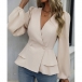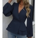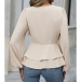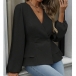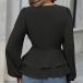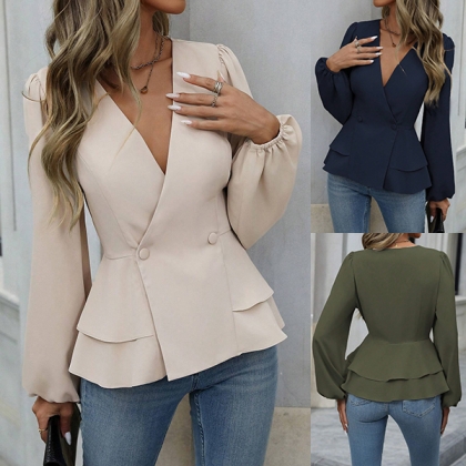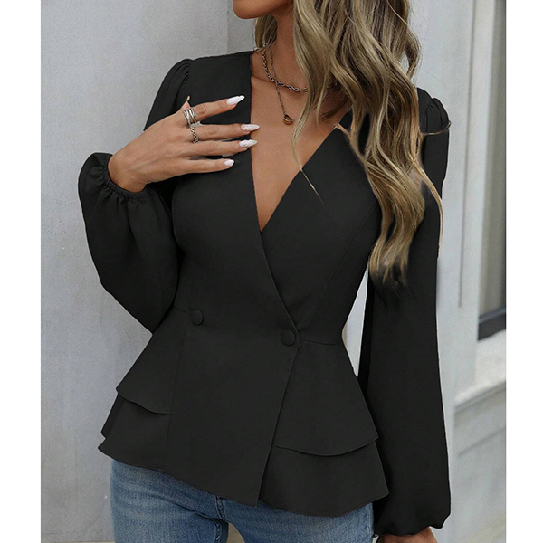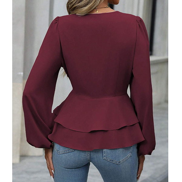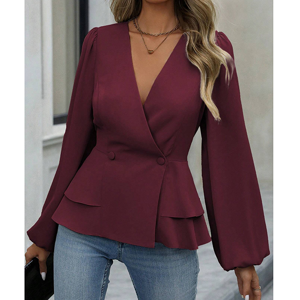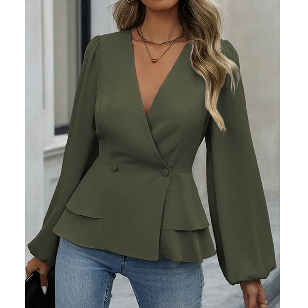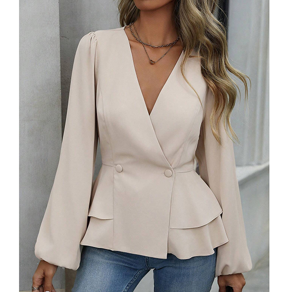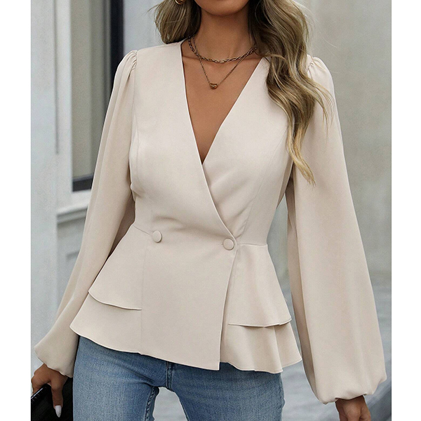 Stilren V-ringad långärmad skjorta med tvåradig knäppning, markerad midja och volangkant