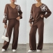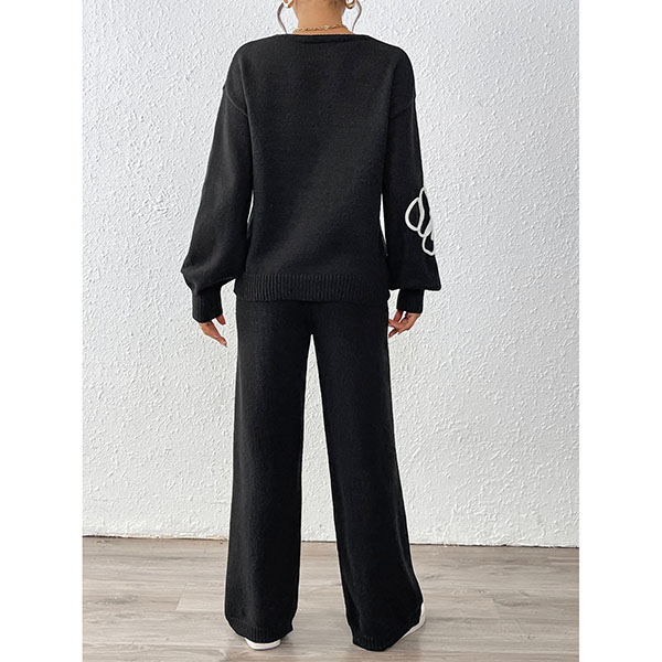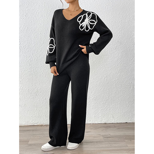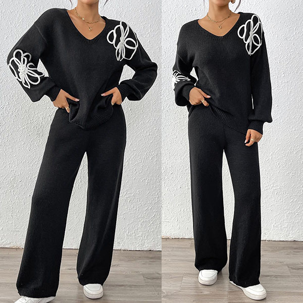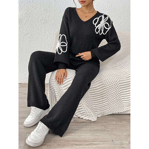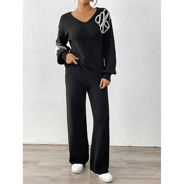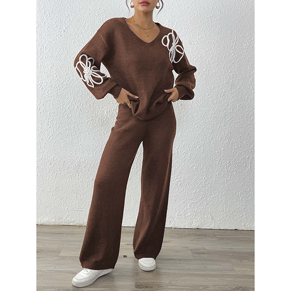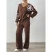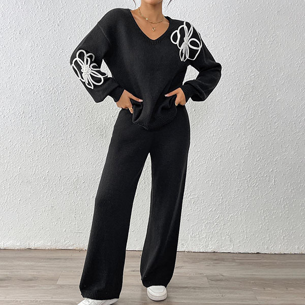 Tvådelat broderat set med V-ringad topp och raka byxor