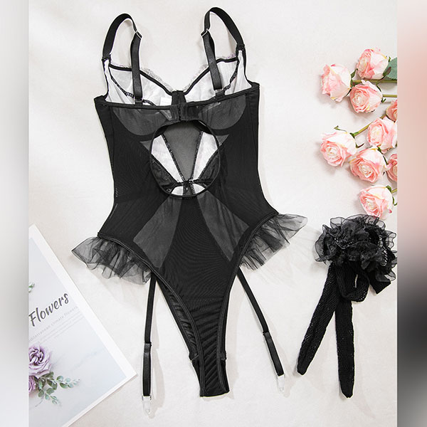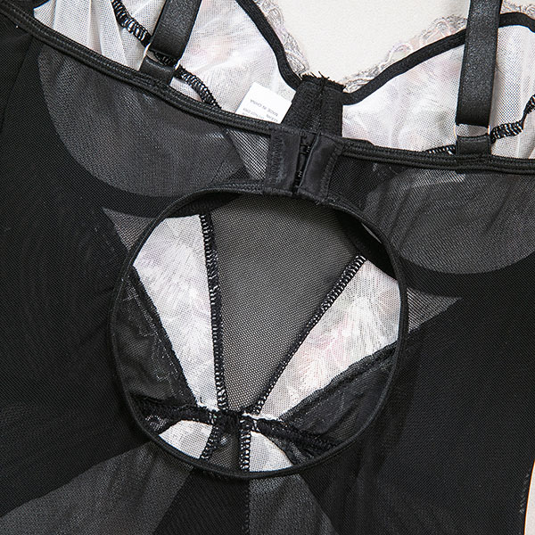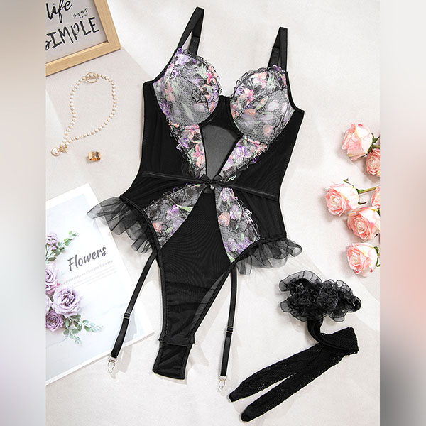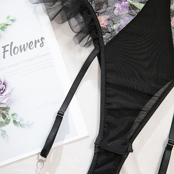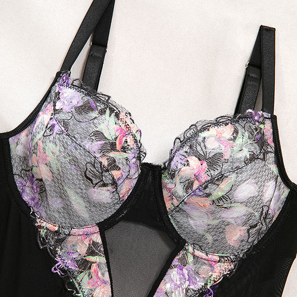 Damunderkläder med broderat blommönster, skarvade partier och justerbara hängslen