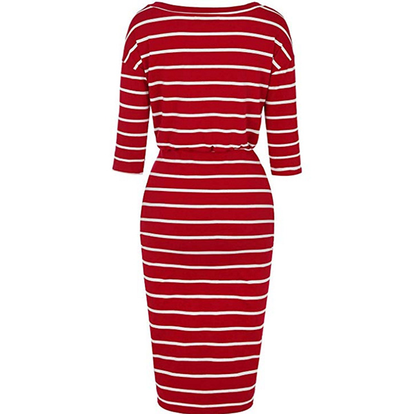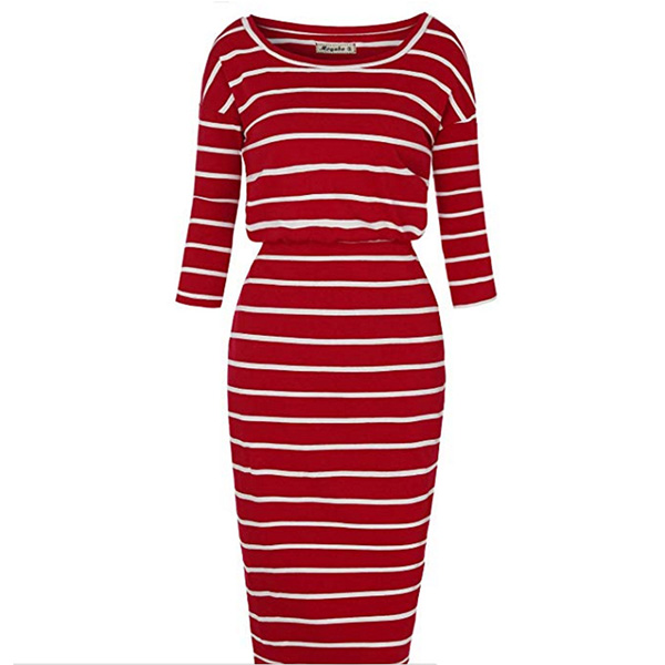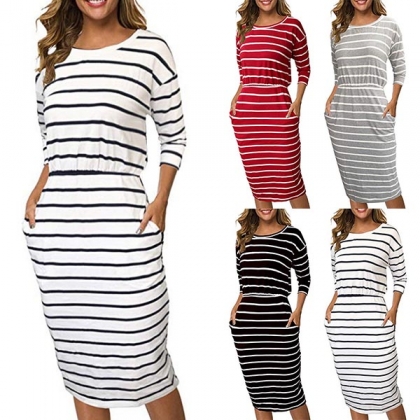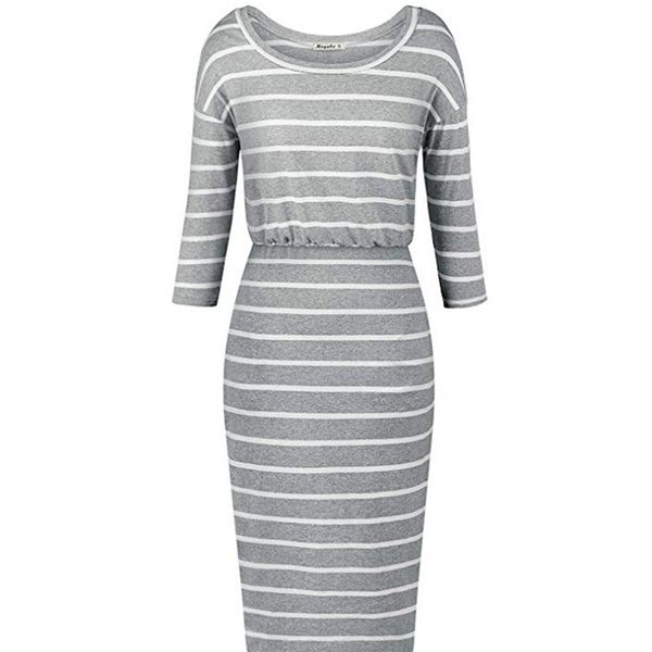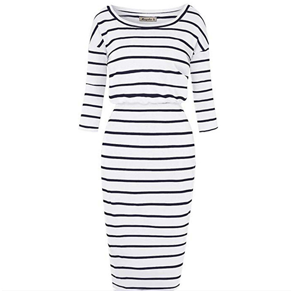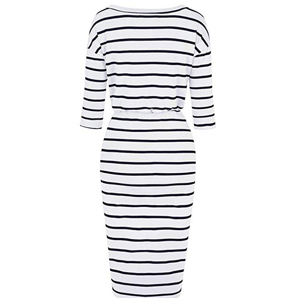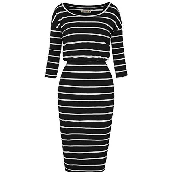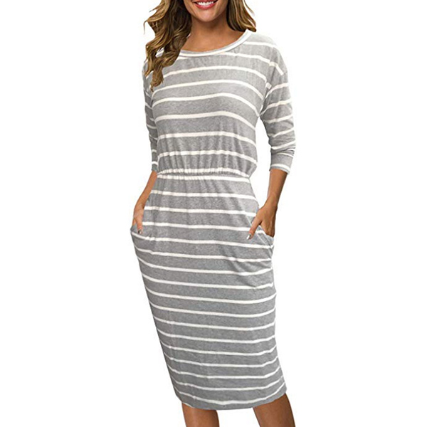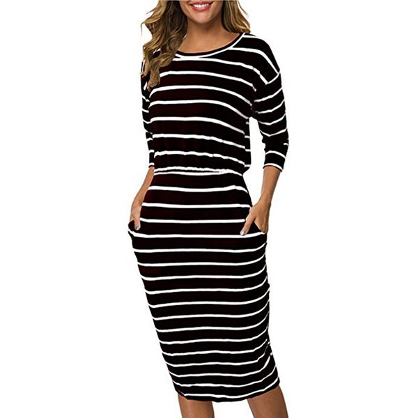 Om du gillar randiga element, kan den här klänningen lätt slå dig. Färdig med 3/4 ärmar, rund hals och hög midja design, vet den här klänningen hur den ska ge dig en mysig men ändå snygg stil. För dina rusade morgnar eller några lata dagar är denna lätt-att-bära klänning en perfekt lösning.