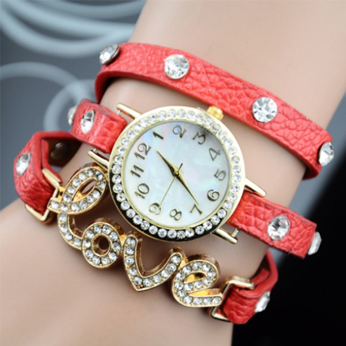 Take this bracelet watch to show your charming style and fashion sense. It features round dial,with rhinestone for decoration. With rhinestone LOVE pendant,multi-layer PU leather watch band,with rhinestone,dazzling and glamorous.