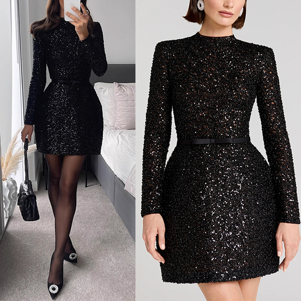 Stråla som ingen annan i vår exklusiva paljettklänning med rundad halsringning och helpaljettbeklädd yta som fångar ljuset från varje vinkel. Det avtagbara satinbältet framhäver midjan och ger en elegant silhuett, medan det mjuka, dubbla fodret garanterar komfort hela kvällen. Jämfört med vanliga festklänningar erbjuder denna modell enastående glans och rörelsefrihet tack vare det stretchiga materialet. Perfekt för nyårsfester, galor, bröllopsgäster och alla tillfällen där du vill vara i centrum.