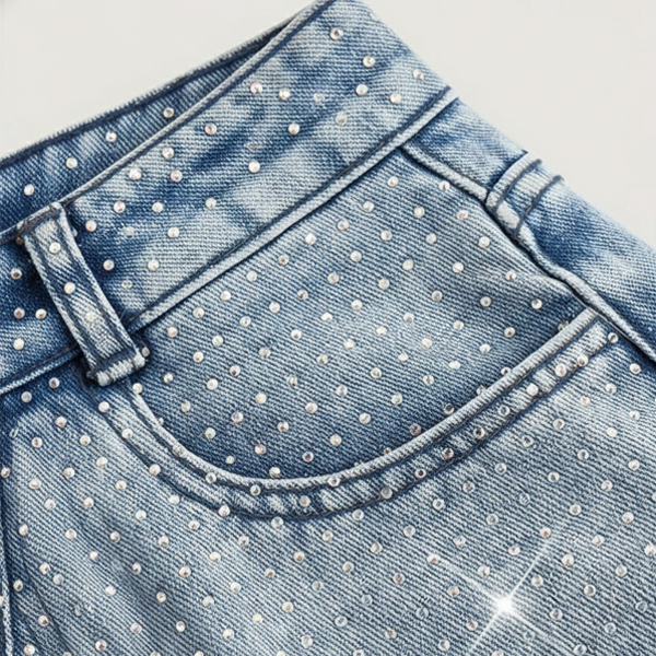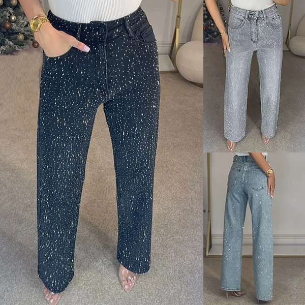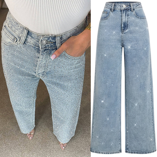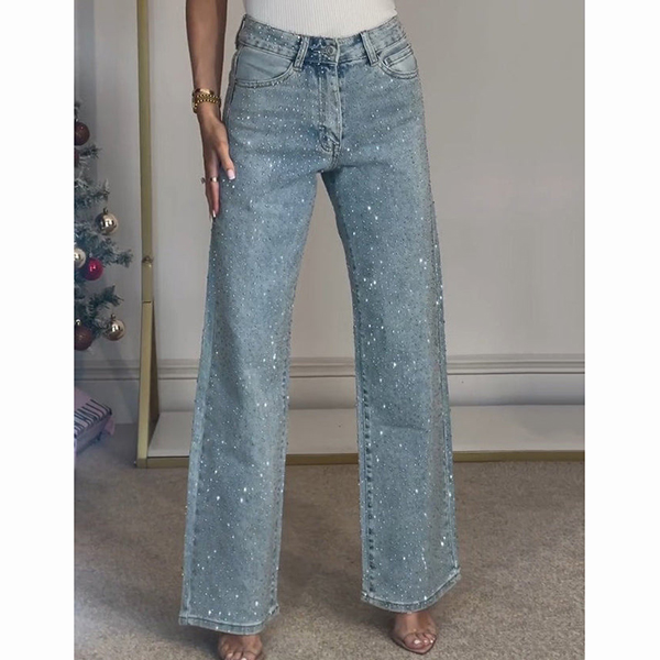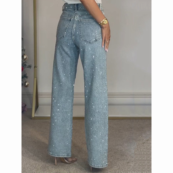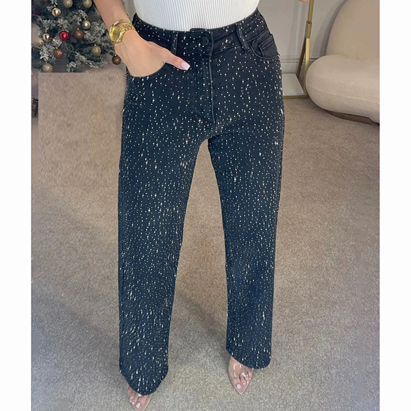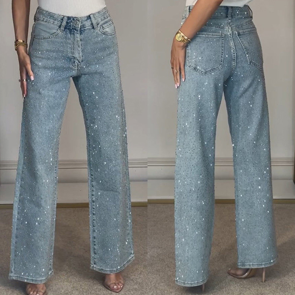 Dessa glamorösa jeans har en smickrande hög midja, glittrande strassutsmyckningar och en klassisk, rakt skuren silhuett som ger modern denimsofistikering. Perfekt för festkläder.