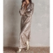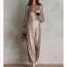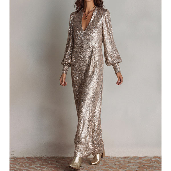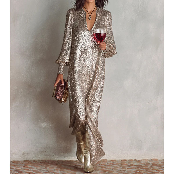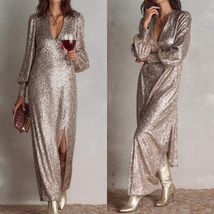 Festklänning i paljetter – glittrig V-ringad långärmad maxiklänning med sidoslits