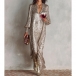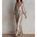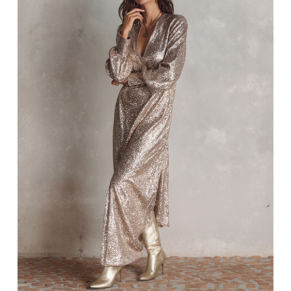 Det här fantastiska plagget har en glamorös V-ringning prydd med paljetter som vackert fångar ljuset. De långa ärmarna utstrålar elegans, medan slitsen i sidan ger en touch av lockelse och rörelse. Matcha det med klackskor med remmar och djärva accessoarer för en oförglömlig look!