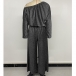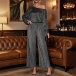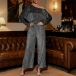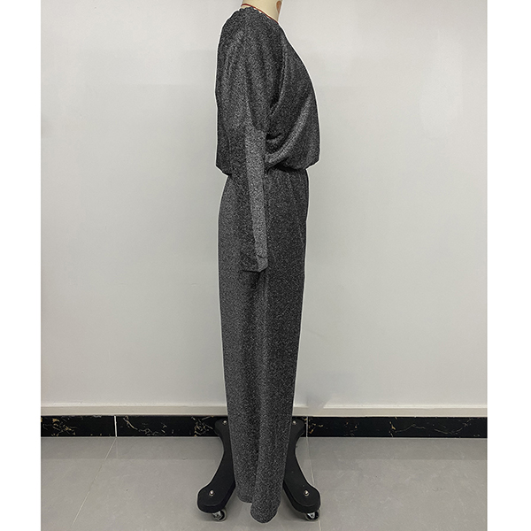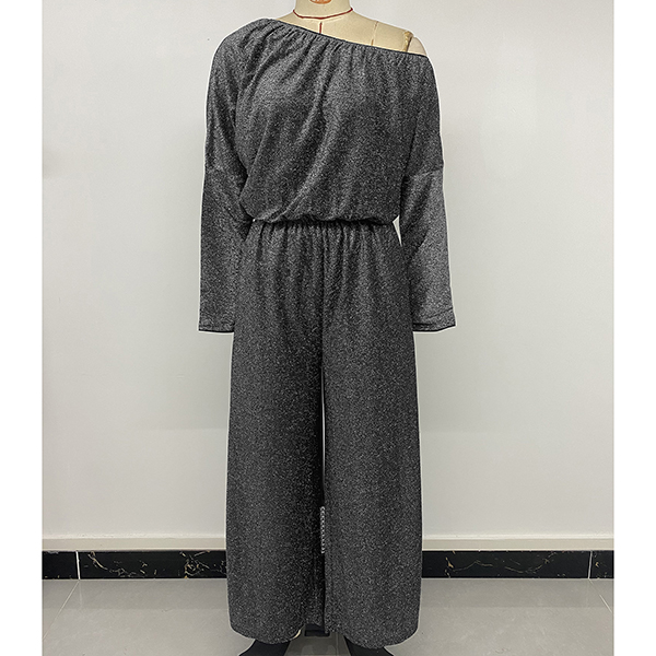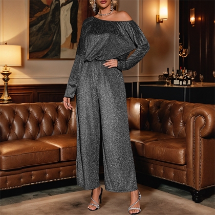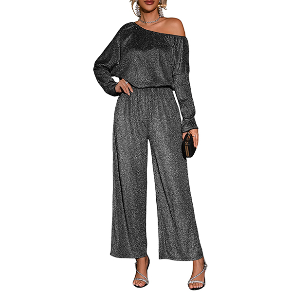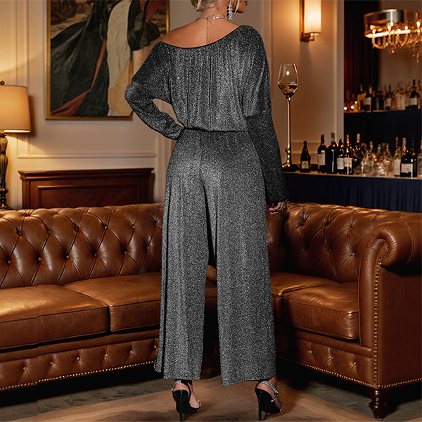 Glamourös fest-jumpsuit med blingeffekt, asymmetrisk axel, lång ärm och hög midja