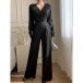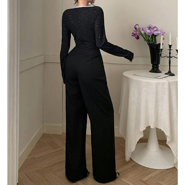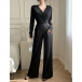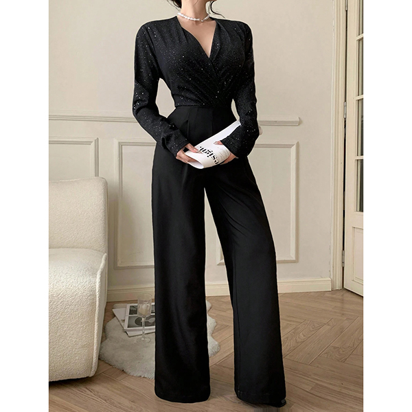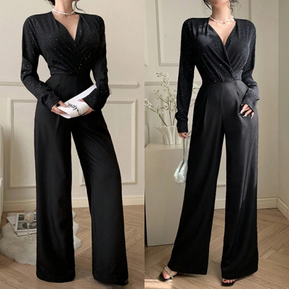 Denna jumpsuit har en modern, trendig stil med elegant V-ringning och en glamoröst utsmyckad design som ger bländande sofistikering. Bling-bling-detaljerna ger en skimrande yta med glamourös charm, medan den höga midjan ger smickrande midjedefinition och moderna proportioner. Perfekt för festliga tillfällen, glamorös styling eller en modern, sofistikerad sammansättning.