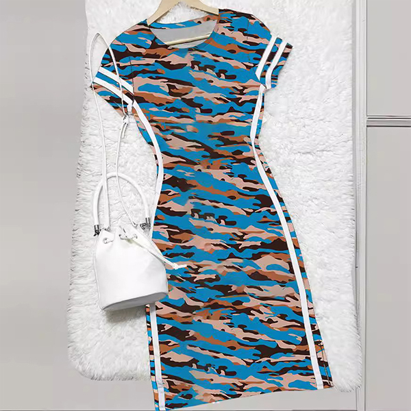 Den här klänningen har en rund hals, korta ärmar och ett kamouflagetryck med sidrandsdetaljer. Den har en bodycon-siluett som framhäver dina kurvor. Är du redo att sticka ut i mängden?