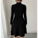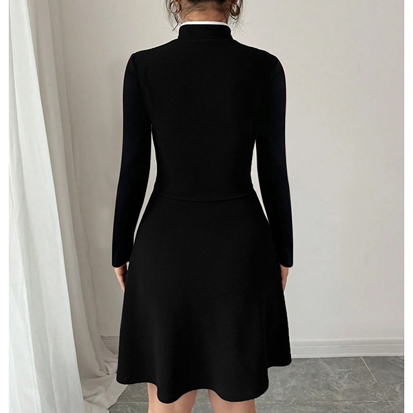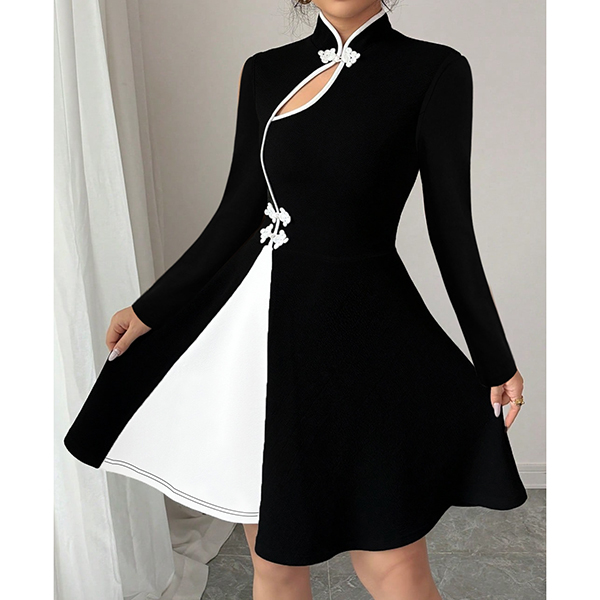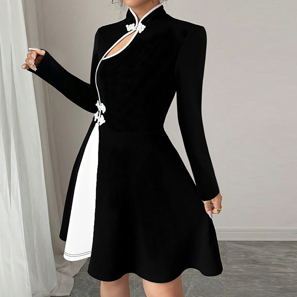 Trendig A-linje-klänning, långärmad med kontrastfärgad knappslå framtill