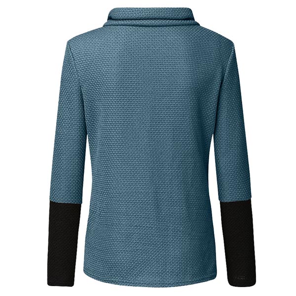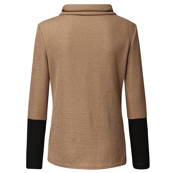 Stickad topp med kontrastfärg, cowl neck och oregelbunden fåll, framknäppning