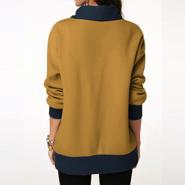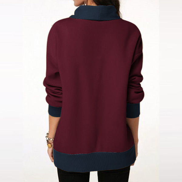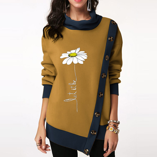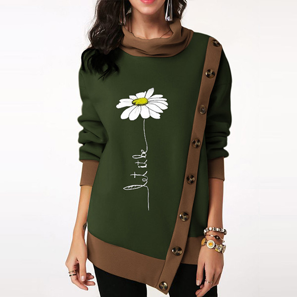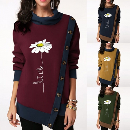 Fashion Contrast Color Cowl Neck Oblique Button Printed Sweatshirt