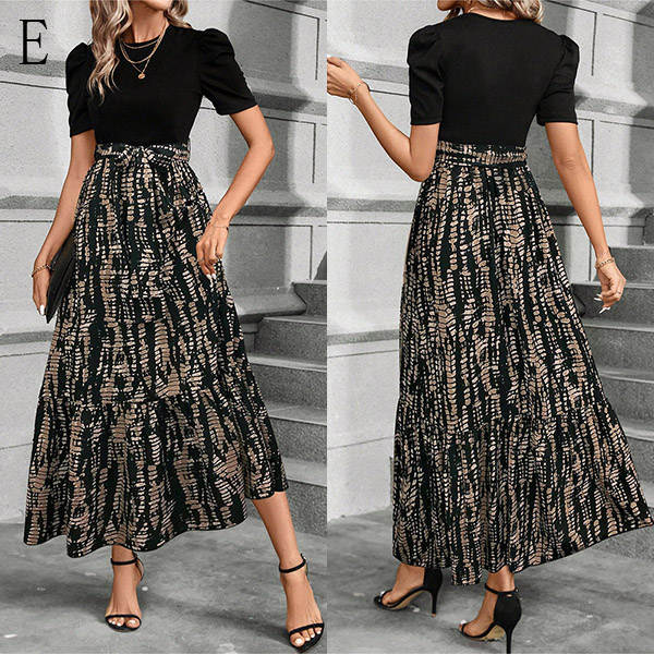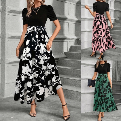 Denna midiklänning är ett snyggt och elegant plagg som kombinerar trendiga detaljer med en feminin silhuett. Kontrastfärgerna och blommiga tryck skapar visuellt intresse och ger en modern look. Den rundade halsringningen och de korta ärmarna ger en klassisk och mångsidig stil. Vill du ha en?