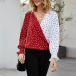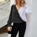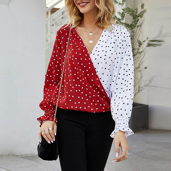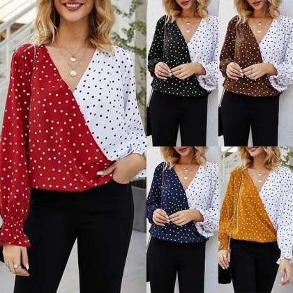 Fashion Contrast Color Dots Printed Long Sleeve V-neck Blouse