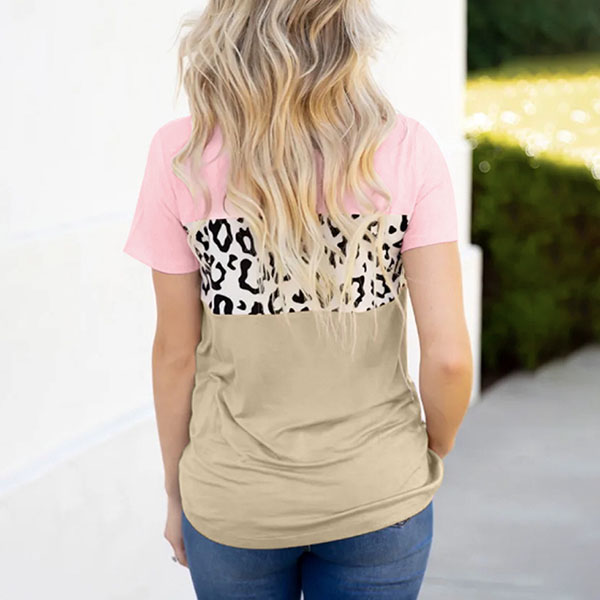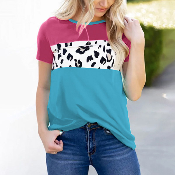 Fashion Contrast Color Leopard Spliced Short Sleeve T-shirt