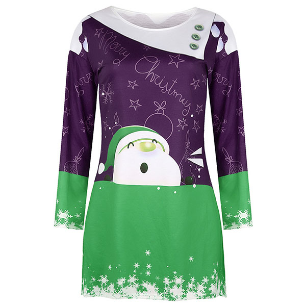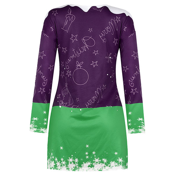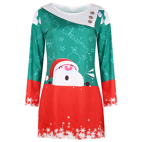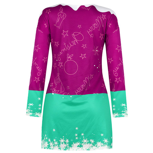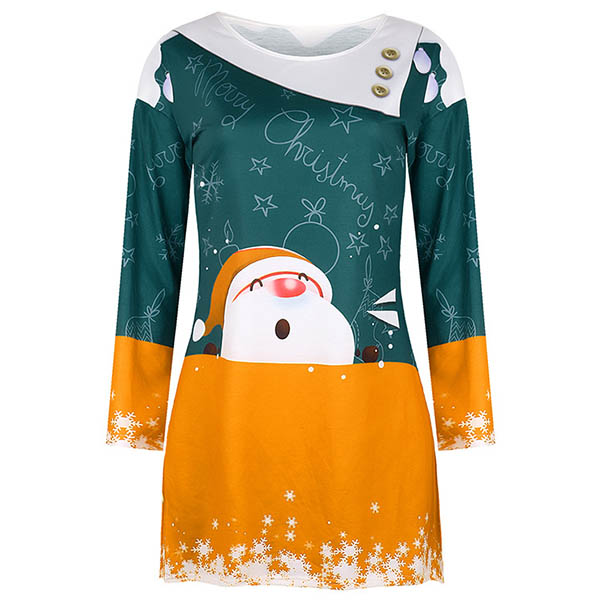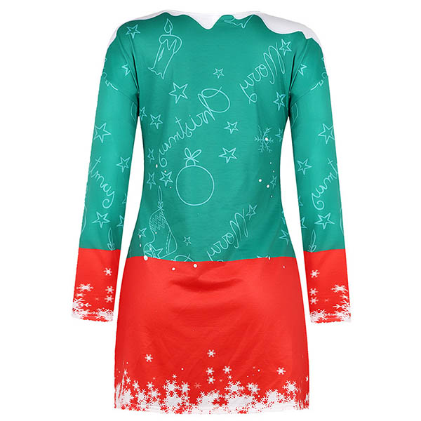 When invited to a Christmas party,you can count on this dress to arouse more attention. The contrast color element and Christmas printed details make this piece look more attractive and eye-catching. Unique collar design will further enhance its charm. Let it give you a happy and wonderful Christmas time.