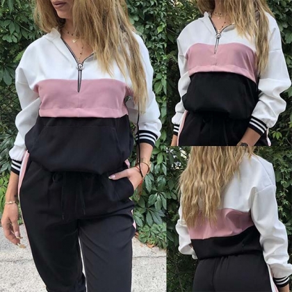 Fashion Contrast Color Long Sleeve Hooded Sweatshirt