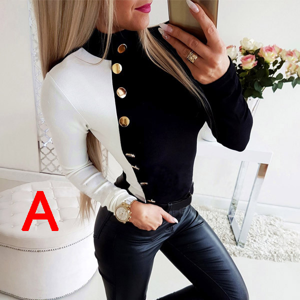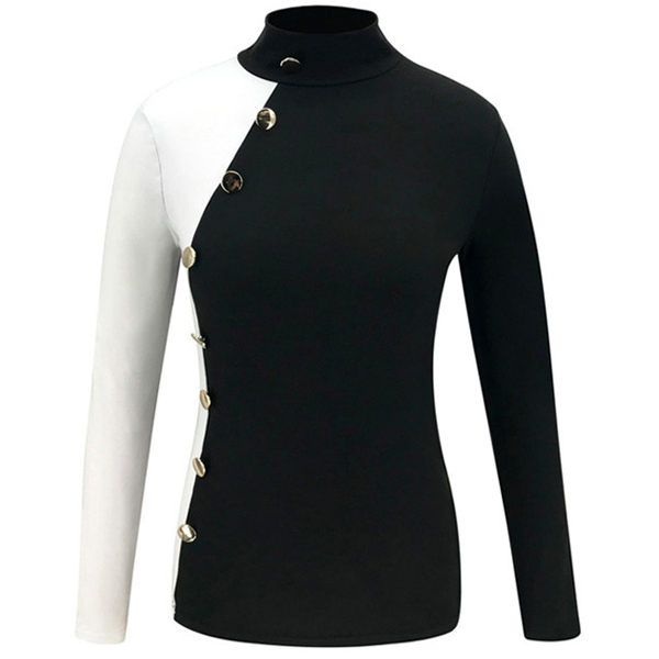 This long sleeves top combines of white and black tone,which makes it look not so simple and dull. The mock neck and front button details will further enhance its charm,while the fit silhouette design can portray your perfect body-line. So why not match with your favourite bottom to have a fashionable dress up?
