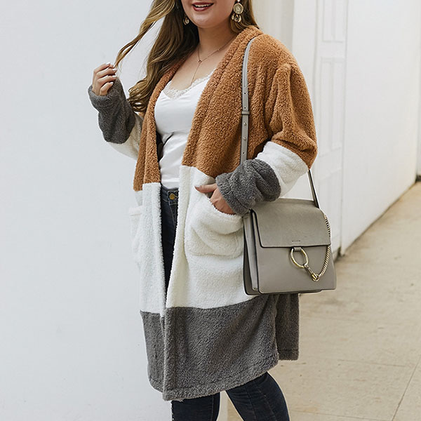 Fashion Contrast Color Long Sleeve Plus-size Plush Cardigan
