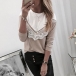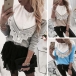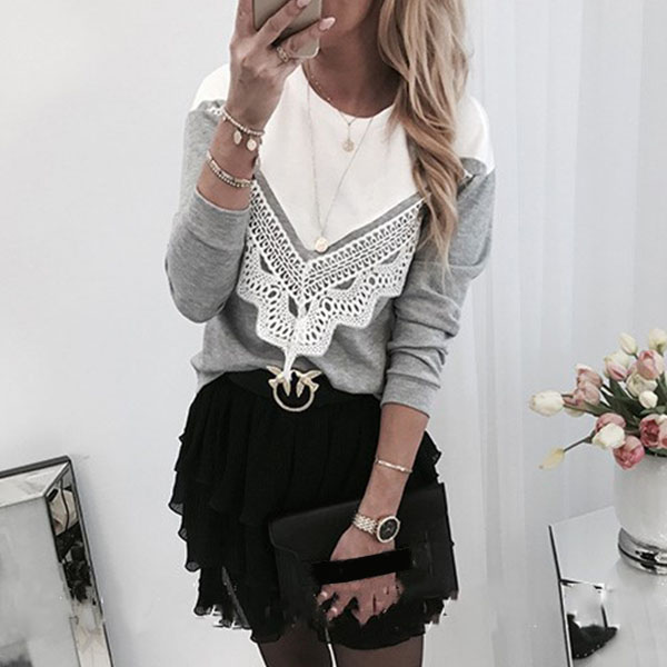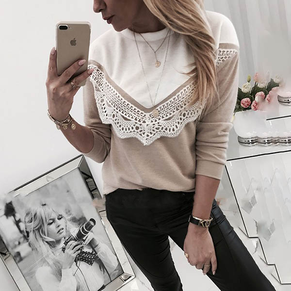 Fashion Contrast Color Long Sleeve Round Neck Lace Spliced T-shirt