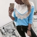 Fashion Contrast Color Long Sleeve Round Neck Lace Spliced T-shirt