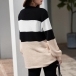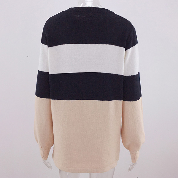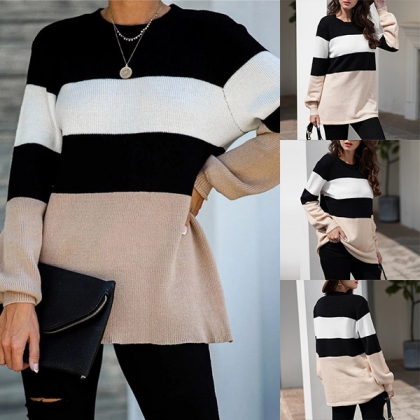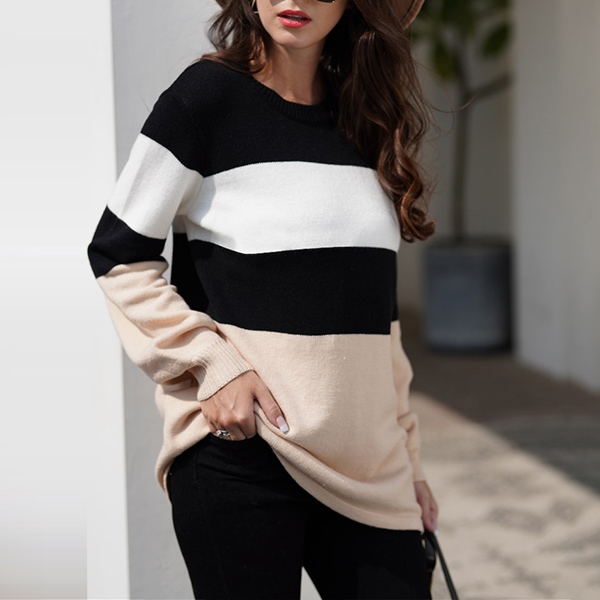 Fashion Contrast Color Long Sleeve Round Neck Loose Knit Top