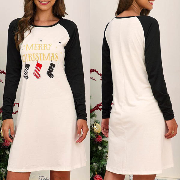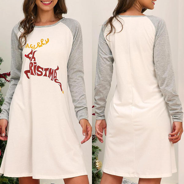 Fashion Contrast Color Long Sleeve Round Neck Printed Christmas Dress