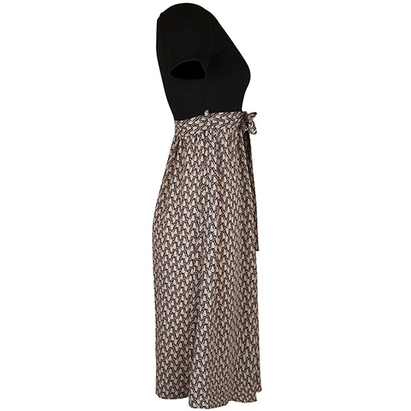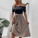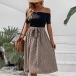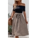 Mode kontrastfärg tryckt Off-the-shoulder kortärmad självknytande miniklänning