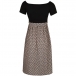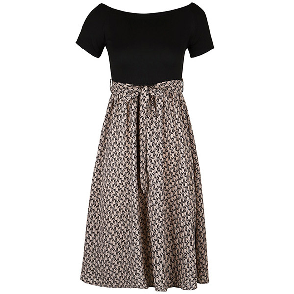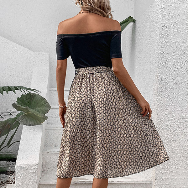Det här är en trendig och chic klänning som kombinerar ett off-the-shoulder svart livstycke, en tryckt kjol, korta ärmar och en självknuten midja för en moderiktig och flirtig look. Denna miniklänning är tillverkad av högkvalitativt tyg och erbjuder både komfort och stil.