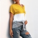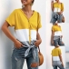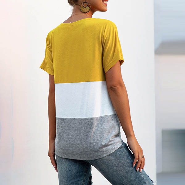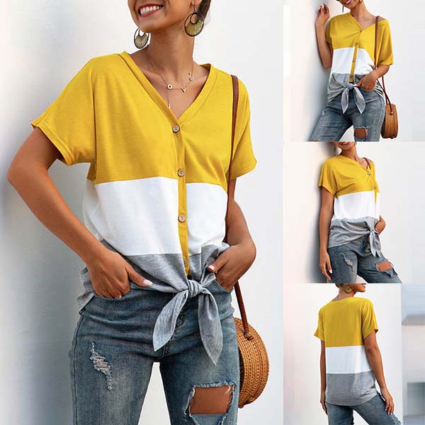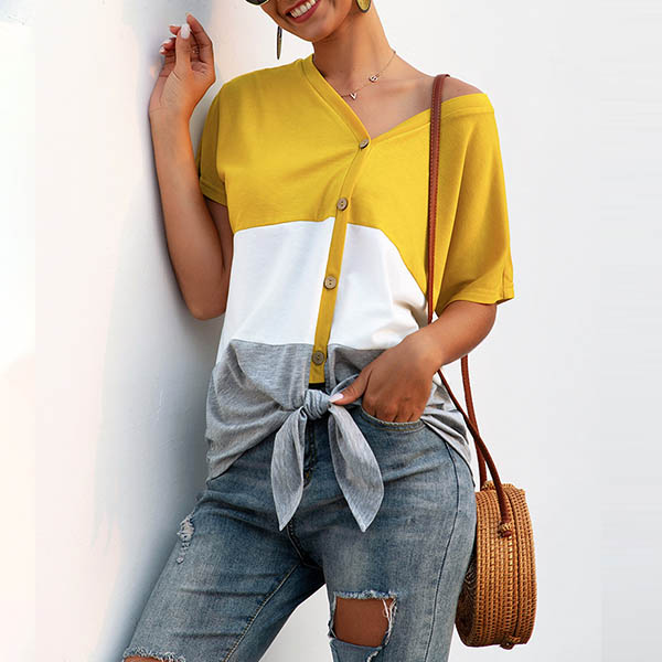 Fashion Contrast Color Short Sleeve V-neck Knotted Hem T-shirt