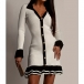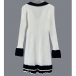 Ribbad klänning med ståkrage, frontknäppning och volangfåll i kontrastfärg
