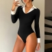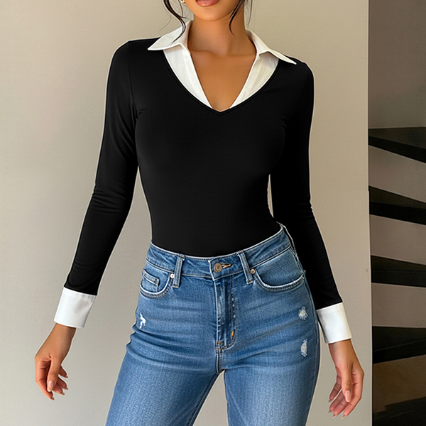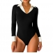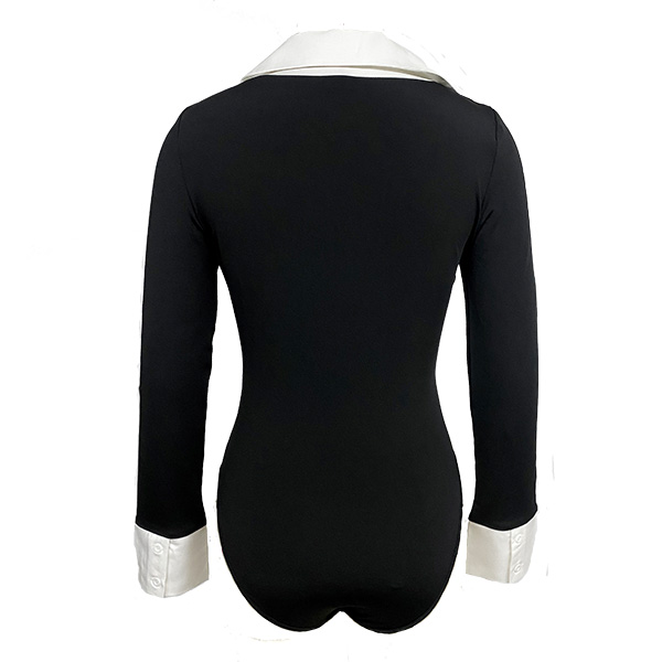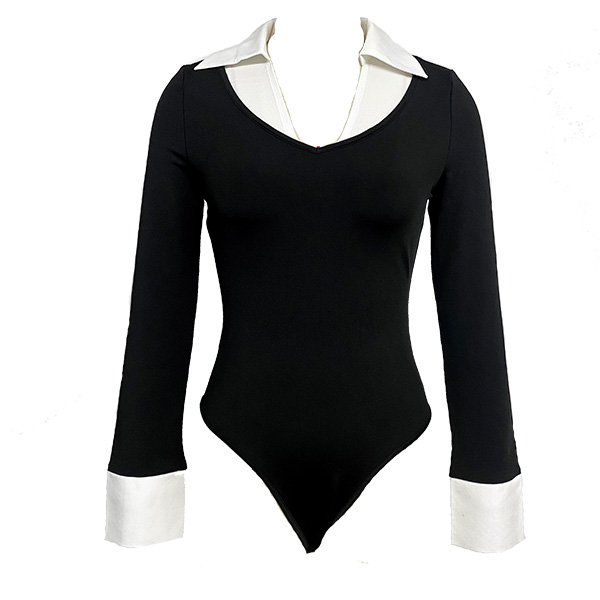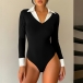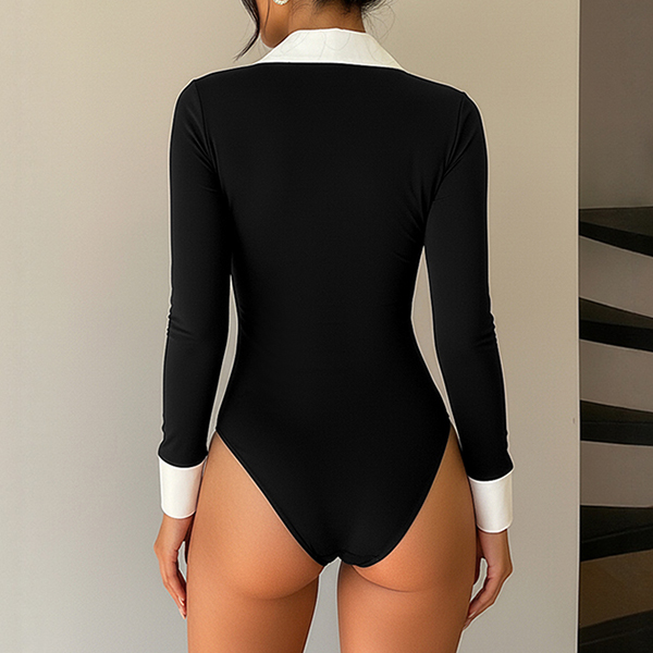 Dam bodysuit, trendig kontrastfärgad med stående krage och V-ringning, långärmad