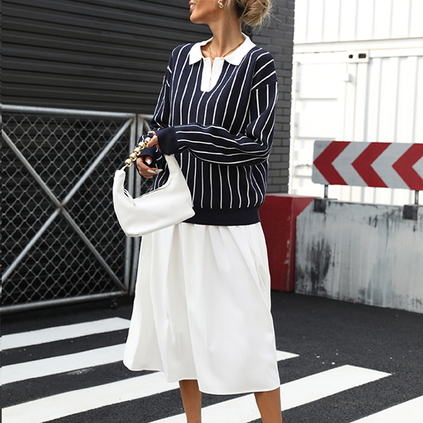 Randig mönstrad tröja med kontrasterande V-ringning – en perfekt mix av klassisk elegans och modern edge. Den färgstarka stående V-ringningen lyfter designen och skapar ett iögonfallande element som får dig att sticka ut i mängden. Vertikala ränder som förlänger siluetten och ger en tidlös, raffinerad look. Tillverkad i mjukt, värmande material som garanterar komfort hela dagen – idealisk för både kontoret, cafébesöket och helgens äventyr. Kombinera med skräddarsydda byxor eller kjol för en polerad outfit, eller matcha med jeans för en avslappnad men stilren stil. En mångsidig bas i garderoben som gör det enkelt att variera din look säsong efter säsong.
