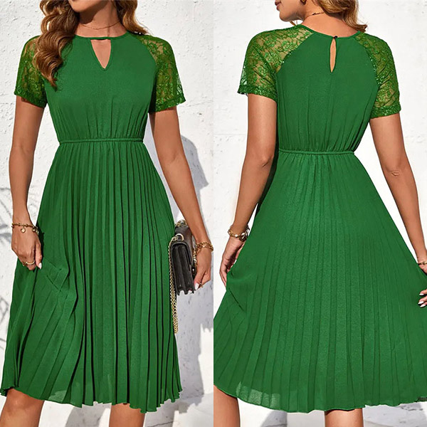 Titta på den här klänningen! Den runda halsen och de korta ärmarna erbjuder en klassisk siluett, medan utskärningen framtill ger en touch av lockelse och kant. Spetsskarvningen längs de korta ärmarna ger en romantisk och elegant touch och skapar en vacker kontrast till den veckade kjolen som ger rörelse och flyt till klänningen. Oavsett om du deltar i ett speciellt evenemang, en dejtkväll eller en utekväll med vänner, kommer denna klänning säkerligen få dig att känna dig självsäker och snygg.