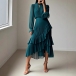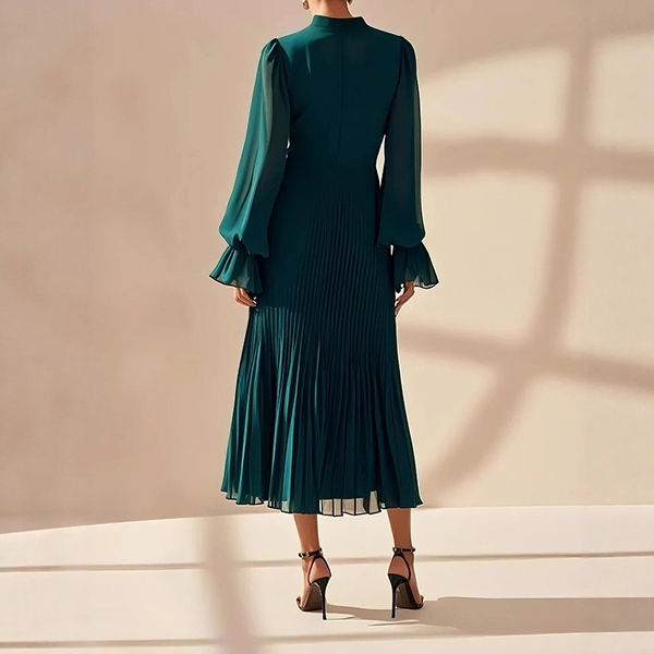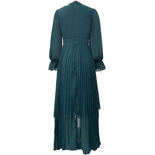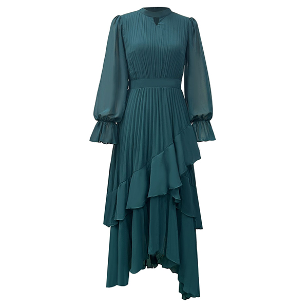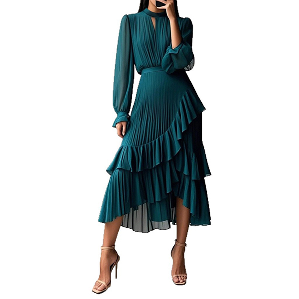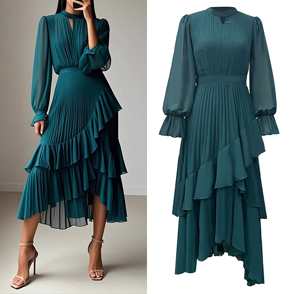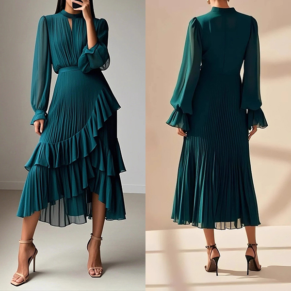 Denna dramatiska veckade klänning kombinerar modern sofistikering med romantisk charm. Rundad halsringning och långa ärmar ger elegant täckning och en tidlös siluett, medan frontutsnittet tillför en oväntad, sexig detalj som skiljer den från mängden. Våra vågformade volangdetaljer skapar mjuk textur och graciös rörelse, och den oregelbundna fållen ger en konstnärlig asymmetri som fångar allas blickar. Tillverkad i ett följsamt, stretchigt material sitter den bekvämt hela kvällen och är enkel att styla med dina favoritsmycken. Perfekt för fester, bröllop eller galakvällar – var stjärnan på festen och lämna ett oförglömligt intryck.