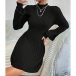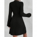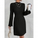 Ribbad damklänning med rund hals, långa ärmar och hög midja