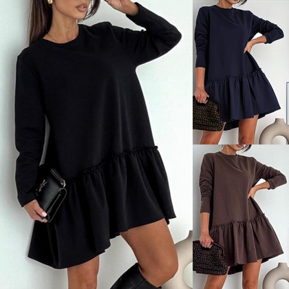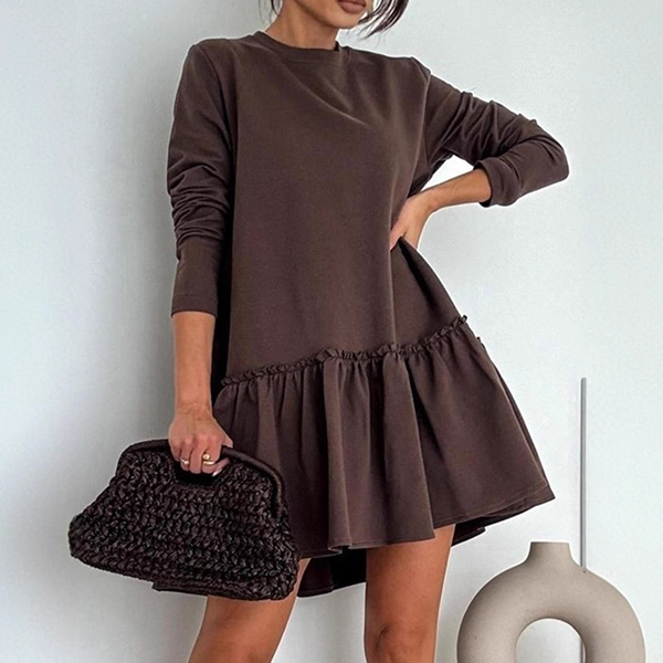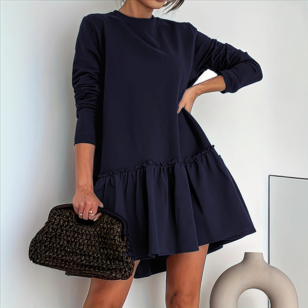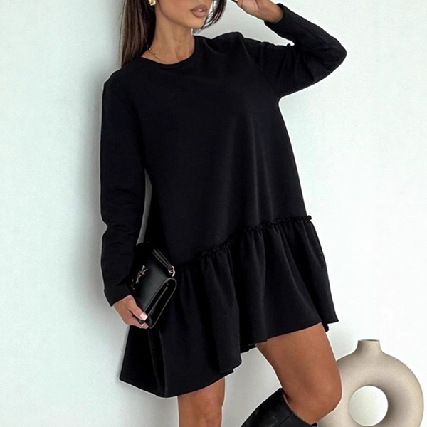 Denna charmiga miniklänning har en klassisk rund halsringning med lekfull volangkant och bekväma, långa ärmar för en modern, feminin elegans. Matcha med stövlar för en elegant och vardaglig look.