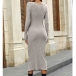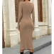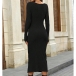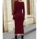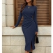 Ribbad klänning med rund halsringning, långa ärmar, sidoknytning och rynkad sidoslits
