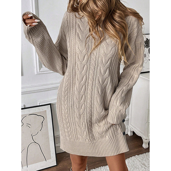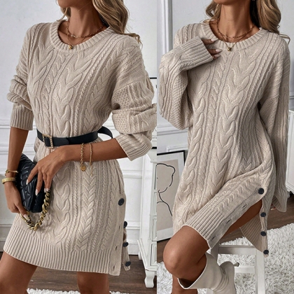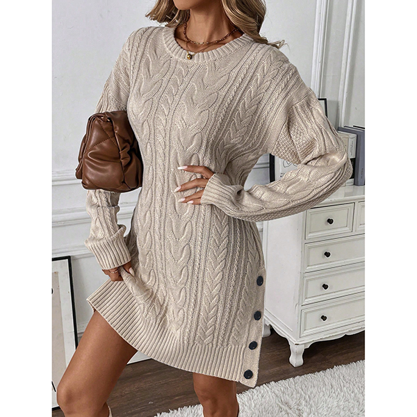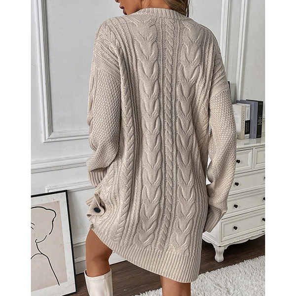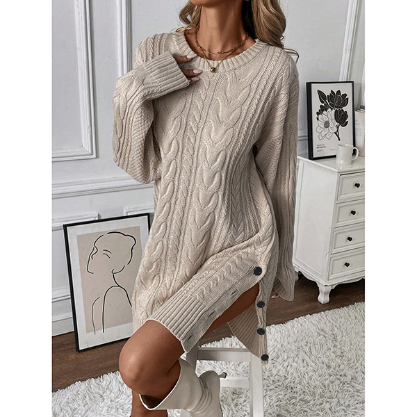 Upplev tidlös elegans med vår exklusiva kabelstickade tröjklänning i mjuk, värmande merinoullmix – en finish som skiljer sig från massproducerade alternativ. Den runda, rena halsringningen lyfter fram en sofistikerad silhuett, medan diskreta knappdetaljer längs sidorna och ett modernt sidosprund med knappknäppning ger både funktion och visuellt djup. Perfekt för höst- och vintergarderoben: bär den som en fristående statement-piece eller matcha med höga stövlar och skärp för en personlig touch. Satsa på en plaggkombination som andas kvalitet, komfort och trendriktig stil!